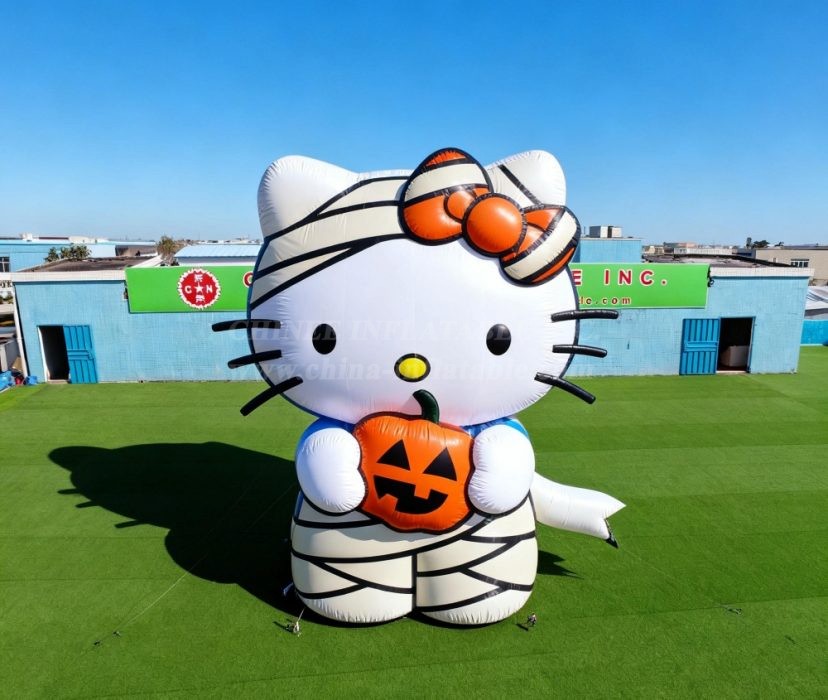 Crafted with meticulous attention to detail, this large-scale inflatable showcases Hello Kitty wrapped in classic white bandages with black stripes, while holding an orange pumpkin with a cheerful jack-o'-lantern face. The vibrant color combination of white, orange, and blue creates an eye-catching display that appeals to both children and adults alike. Standing tall and proud on any lawn or event space, this inflatable serves as an irresistible photo opportunity and conversation starter.