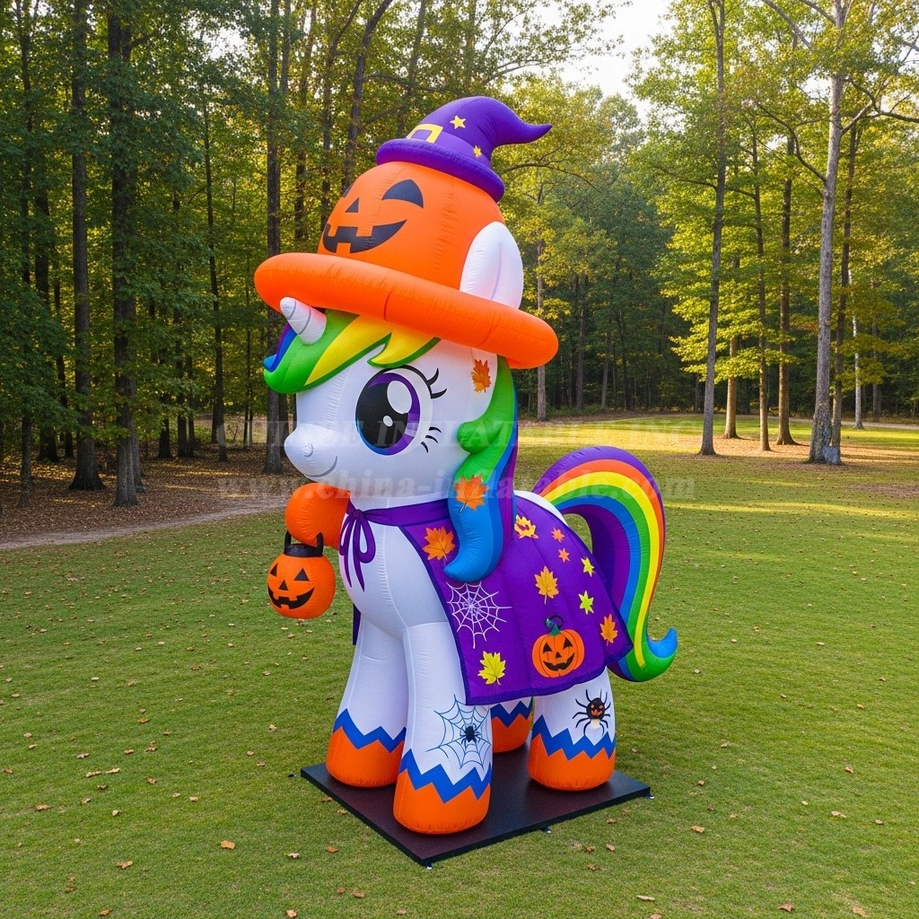 Bring spellbinding charm to your seasonal events with the Cartoon3-339 Halloween Unicorn inflatable from Chinee Inflatables. This adorable unicorn features a colorful rainbow mane and tail, a cheerful jack-o'-lantern hat, and festive graphics like spiders, webs, and autumn leaves—perfect for instantly creating a playful Halloween vibe. Designed as a decorative showpiece, this model is part of our Inflatable Cartoons category and is ideal for front yards, store entrances, school fairs, pumpkin patches, and themed photo ops.