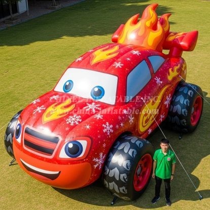 Turn heads at any event with the Cartoon3-448 Monster Truck Theme Inflatable Cartoons display by Chinee Inflatables Inc. This eye‑catching inflatable features an adorable red monster-truck style car with oversized tires, big friendly eyes, and vivid flame graphics, accented by snowflake details for a cool winter vibe. Designed as a decoration piece (not for bouncing or sliding), it’s perfect for entrances, photo ops, brand zones, and family attractions where you want instant visual impact and steady foot traffic.
