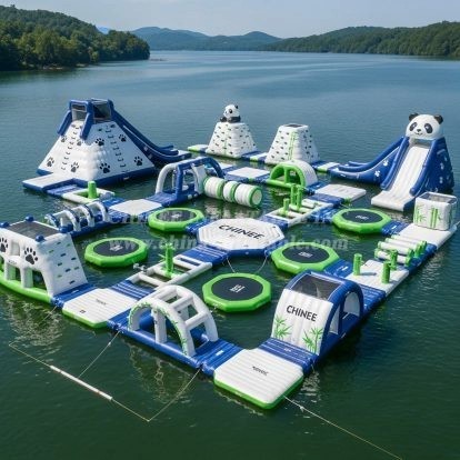 Bring an unforgettable attraction to your lake, marina, or resort with the S335 Panda Theme Water Park from Chinee Inflatables. This modular floating playground blends adorable panda styling and bamboo graphics with a full spectrum of aquatic challenges, creating a destination guests will line up for. The layout features tall climbing towers with slides, balance logs, jump pads, crawl tunnels, stepping pads, and transfer bridges designed to keep traffic flowing and excitement high. Multiple entry points allow operators to manage capacity safely while maximizing throughput during peak hours.
