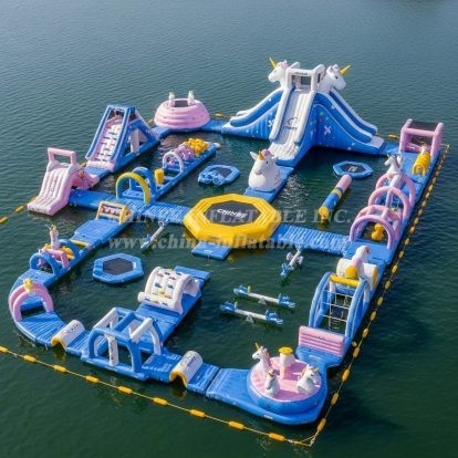 Make a splash with the S340 Unicorn Water Park from Chinee Inflatables Inc., a spectacular floating playground designed to transform lakes and calm coastal venues into high‑capacity attractions. This modular setup combines towering dual slides, climbing challenges, balance beams, crawl-through arches, jump pads, and splash zones—arranged around wide, non-slip walkways for smooth guest circulation and easy supervision. The whimsical unicorn theme and pastel rainbow accents deliver instant visual impact for resorts, camps, marinas, and rental operators seeking a family-friendly centerpiece.