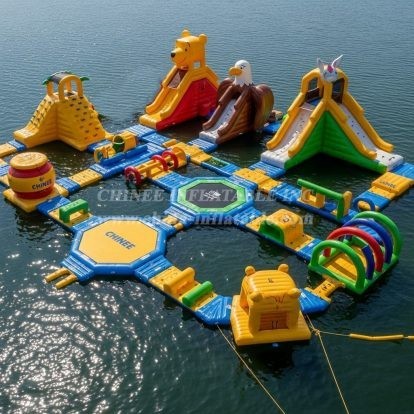 Make your waterfront the hottest destination with the S343 Animal Theme Water Park by Chinee Inflatables Inc. This vibrant floating aqua playground blends multiple slides, climbing elements, balance challenges, and splash zones into one cohesive layout designed for high throughput and unforgettable fun. Eye‑catching animal motifs—such as a friendly bear, a proud eagle, and a whimsical unicorn—create instant visual appeal and clear activity zones that guide traffic and entertain guests of all ages.