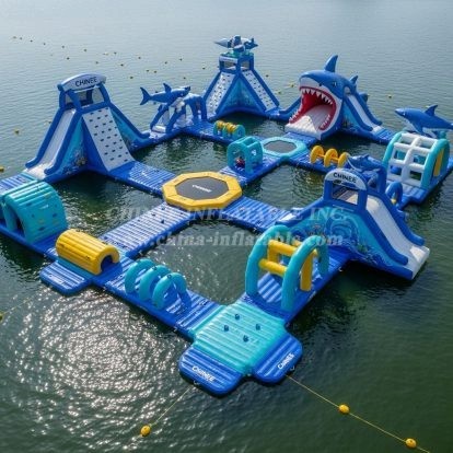 Make waves this season with the S374 Shark Theme Water Park from Chinee Inflatables Inc., China’s leading inflatable manufacturer since 1998. Designed as a modular floating adventure, this vibrant blue ocean world combines slides, climbs, balance logs, arches, and a central jump pad to keep guests moving from one exciting challenge to the next. Signature details—like the giant shark mouth slide and playful dolphin accents—create an eye‑catching centerpiece for lakes, bays, and resort lagoons.