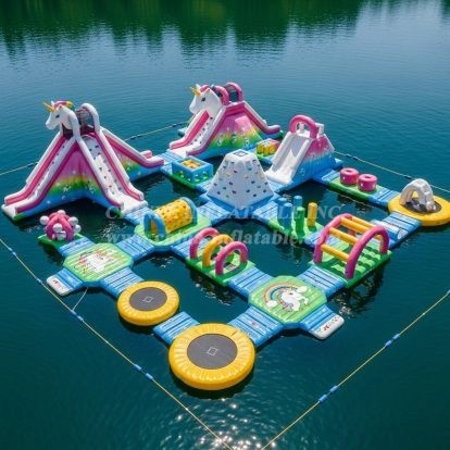 Turn your waterfront into a magical attraction with the S407 Unicorn Theme Water Park by Chinee Inflatables. Designed as a modular floating adventure, this colorful setup blends whimsical unicorn styling with a wide range of active features to keep guests of all ages moving and smiling. Twin unicorn slides anchor the layout, complemented by climbing elements, balance challenges, inflatable hurdles, rolling tunnels, stepping posts, and built‑in jump pads. Multiple connection docks and pathways guide traffic safely around the course while encouraging continuous play and friendly competition.