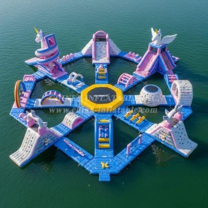 Bring fairytale magic to the water with our S409 Unicorn Theme Water Park by Chinee Inflatables. This stunning modular aqua course features pastel pinks and blues, playful unicorn and pegasus elements, rainbow arches, climb-and-slide towers, balance beams, hurdles, and a generous central splash/landing zone. Designed for high throughput and non-stop fun, it’s perfect for lakes, reservoirs, and beachfront operators who want a photogenic attraction that drives social shares and repeat visits.