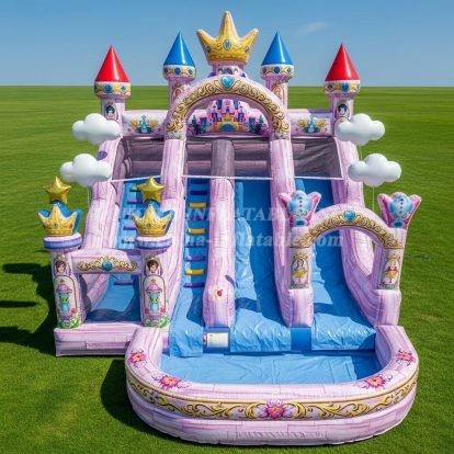 Create a royal centerpiece for your next event with the T8-8766 Princess Castle Inflatable Water Slide. This dazzling, castle‑themed attraction features twin climbing lanes that lead to dual sliding chutes, crowned turrets, and delightful decorative details throughout. A spacious splash zone at the base adds extra excitement and soft water landings, making it a hit for warm‑weather parties and community events. Crafted by Chinee Inflatables Inc. (est. 1998), this slide blends eye‑catching design with proven manufacturing quality. Reinforced stitching, durable PVC tarpaulin, and safety netting at the top platform help ensure dependable performance and peace of mind for operators. The bright artwork, floral trim, and whimsical accents photograph beautifully, drawing families in and keeping lines moving thanks to the dual‑lane layout. Ideal for rental fleets, schools, fairs, and backyard celebrations, the T8-8766 is engineered for efficient setup and takedown with robust anchor points and integrated drainage. Available with customization options to match your color palette or branding. Backed by over 20 years of export experience to the USA, UK, Russia, and the Middle East from our Guangzhou factory, Chinee Inflatables delivers reliable products and responsive support. Bring a touch of fairytale magic to your venue and keep guests smiling ride after ride with this premium inflatable water slide.
