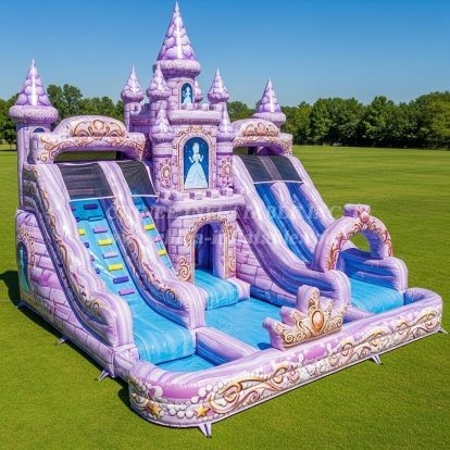 Create a royal centerpiece for your next event with the T8-8770 Princess Castle Inflatable Water Slide by Chinee Inflatables Inc. This enchanting lavender castle features dual-lane slides, an integrated central climb, and splash landing zones that keep the action moving and the fun continuous. Ornate crown and scroll details, jewel accents, and soft floral artwork complete the fairytale look, making it an instant favorite for children who love imaginative play.