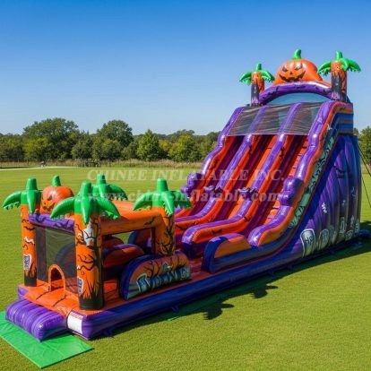 Celebrate the spooky season with this thrilling Halloween Theme Inflatable Slide. Featuring vibrant pumpkins creepy spiders, and eerie tombstones, it offers a fun and festive experience for kids. Its tall sliding lanes provide excitement and safe play in any outdoor event, making it a perfect seasonal attraction that captures the Halloween spirit.