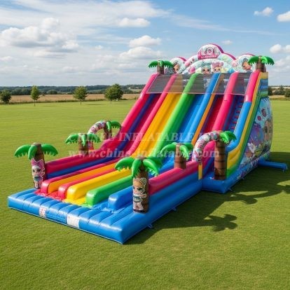 This vibrant L.O.L. SURPRISE Inflatable Slide features multiple colorful lanes with tropical palm tree accents, creating a fun and play experience. Perfect for kids' outdoor parties and events, it combines eye-catching design with safe, sturdy construction. Bring the thrill of sliding and tropical vibes together for endless adventure and joy.