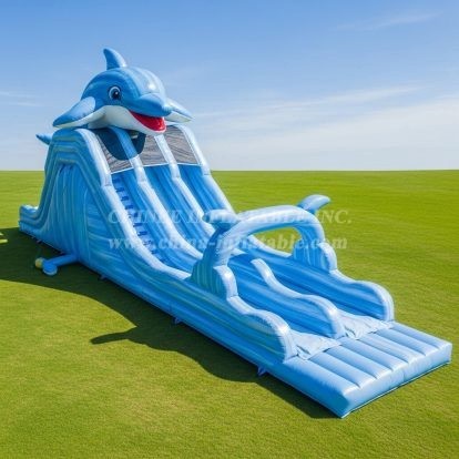 Dive into aquatic fun with this vibrant dolphin-themed inflatable water slide. Designed for thrilling splashes and endless excitement, it features dual sliding lanes and a playful dolphin topper. Perfect for summer events, this slide combines eye-catching design with safe, durable construction to keep kids entertained for hours under the sun