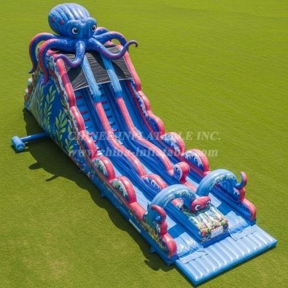 Dive fun with this vibrant octopus-themed inflatable water slide featuring dual lanes for double the excitement. The eye-catching tentacles and oceanic design bring underwater adventure to life. Perfect for summer parties and water parks, this durable slide delivers endless wet and wild entertainment for kids and families alike.