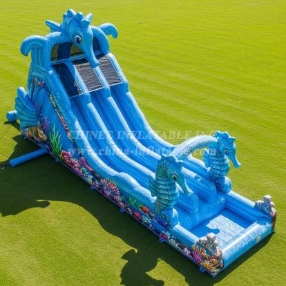 Make a splash with this seahorse-themed inflatable water slide! Featuring three wide lanes, high-visibility safety nets, and a splash pool, this vibrant ocean design brings instant fun to parks, resorts, and events. Built from heavy-duty PVC with reinforced seams and easy anchors, it delivers reliable performance and eye-catching appeal for summer entertainment and rental fleets.