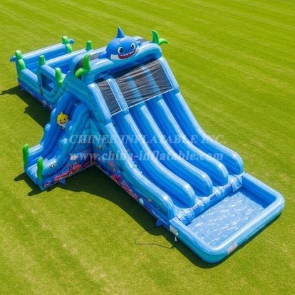 Exciting triple-lane inflatable water slide featuring playful Baby Shark and ocean-themed graphics. Built with heavy-duty PVC, reinforced seams, and safety netting at the top, it delivers splashy fun for backyard parties, rentals, and parks. Wide lanes and a shallow splash pool offer safe, thrilling rides for kids. Easy to set up and clean—ideal for summer events and family entertainment.