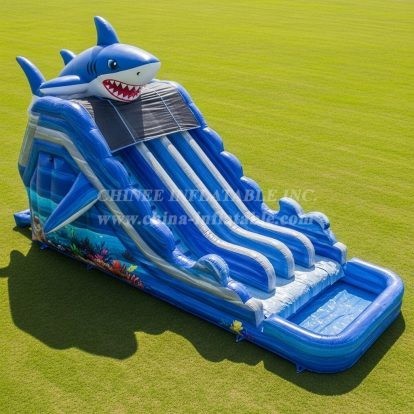 Make a splash with this T8-9211 Shark Inflatable Water Slide. Features a dramatic shark topper and three parallel lanes that feed into a shallow splash pool — perfect for backyard parties, rentals, and summer events. Constructed from heavy-duty PVC with safety sidewalls, anti-slip steps, and a protective top net. Quick to set up, easy to clean, and built for hours of cool, thrilling fun.