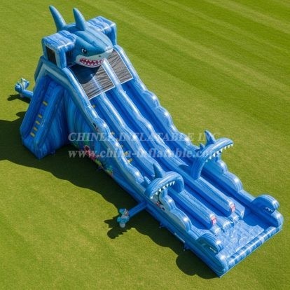 Make a splash with this towering shark-themed inflatable water slide! Featuring a dramatic shark head, triple lanes, and vibrant ocean graphics, it delivers high-capacity thrills for parks, events, and rentals. Built from heavy-duty PVC with safety netting and easy setup, this eye-catching slide combines stunning visuals and reliable performance for unforgettable summer fun.
