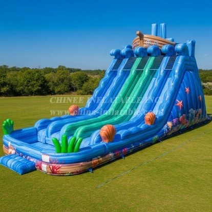 Make a splash with this T8-9266 Ocean Theme Inflatable Water Slide! Featuring three high-speed lanes, a shallow splash pool, and vibrant undersea graphics with a pirate ship, starfish and shells, this durable PVC slide delivers thrilling fun for parties, rentals, and water parks. Easy to set up, commercial-grade materials and reinforced seams ensure safety and lasting performance for summer events and family entertainment.